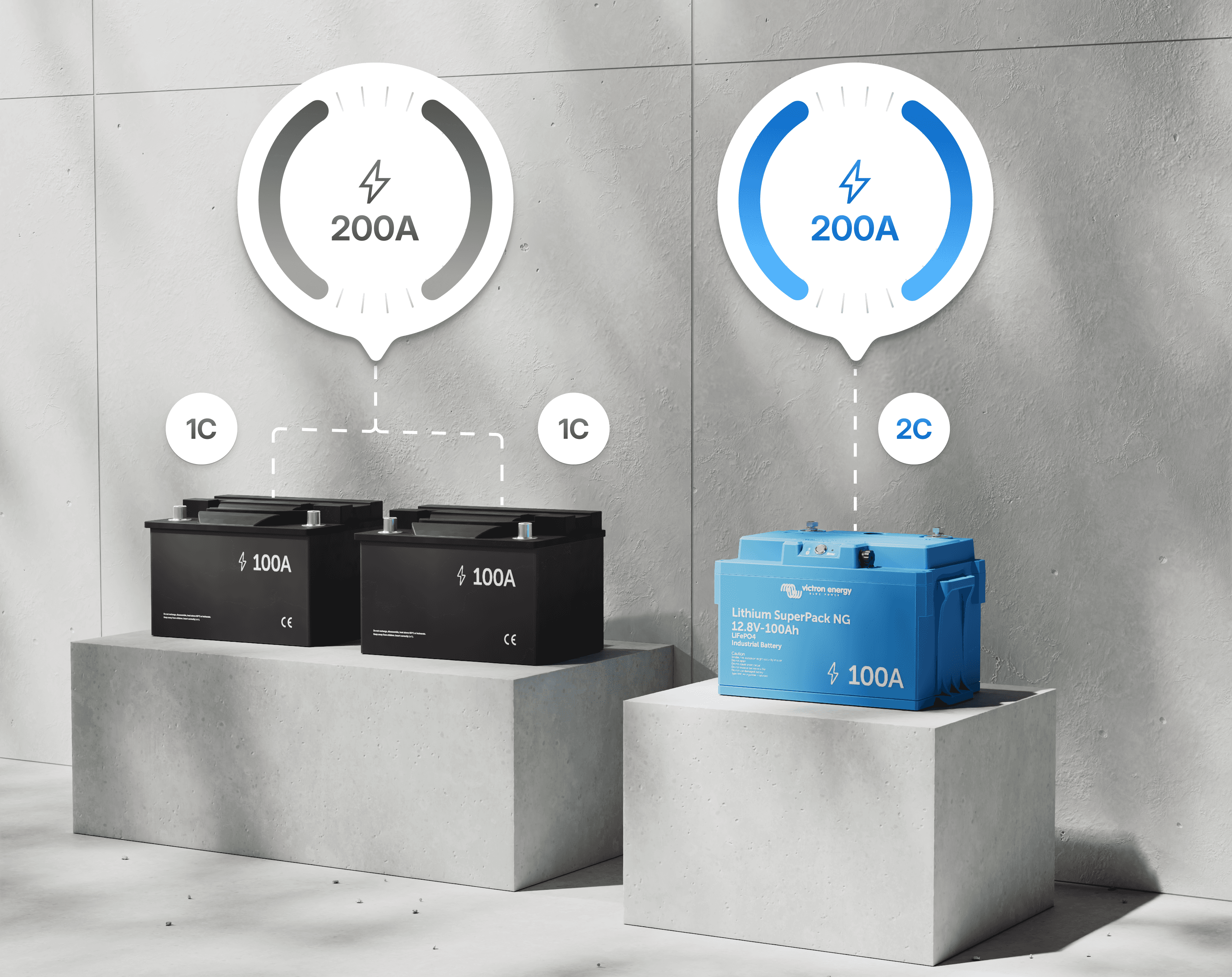 Mitoita energiatarpeiden, ei tehonpiikkien mukaan. Jopa 2C:n purkausvirroilla SuperPack NG pystyy tuottamaan kaksi kertaa nimellistehonsa jatkuvasti, käsitellen kuormia, jotka yleensä vaatisivat suurempia tai useampia yksiköitä.