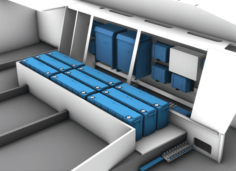 Energy storage and charging is performed by nine Lithium Battery Smart LiFePO4 25.6/200Ah forming the service batteries. They operate two MultiPlus 24/5000 inverter/chargers which simultaneously serve as battery-chargers and transfer switches for uninterrupted power-source switching between shore AC and inverter operation.