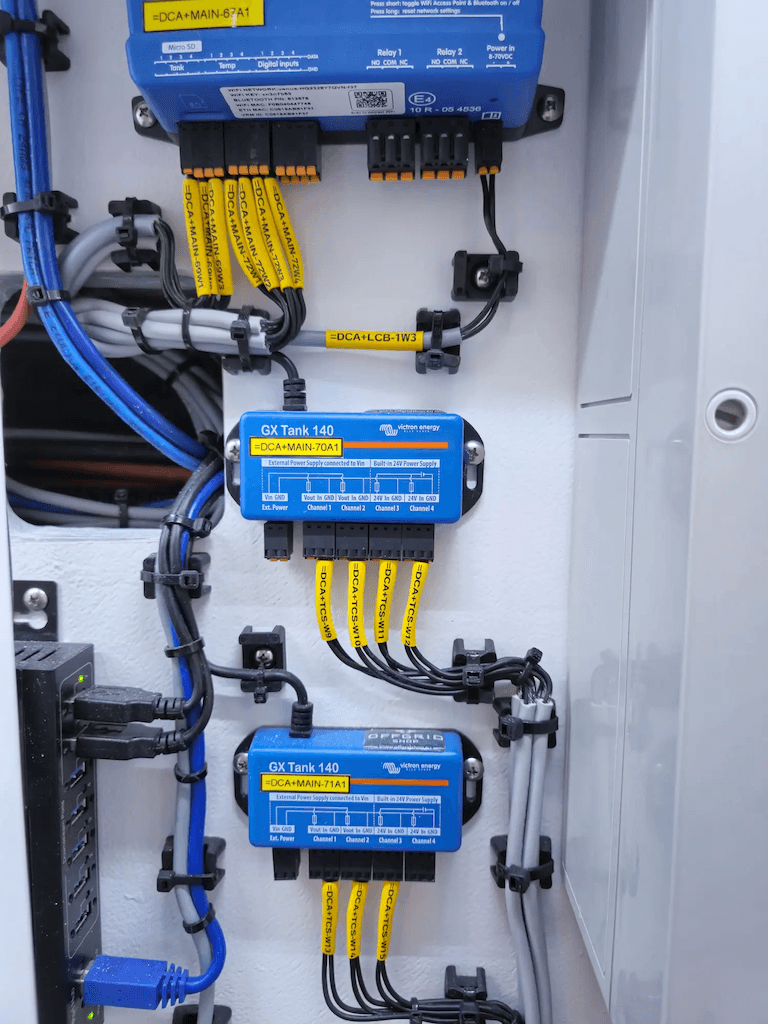 The Cerbo GX with GX Touch 70 serves as the central interface for controlling the system. Temperatures, tank levels, and various digital inputs are also processed here. A Beckhoff Programmable Logic Controller is used to control numerous tanks (in order to minimize the number of through-hull fittings, the owner requested small tanks for each waste area, with centralized and automated waste management). Fill levels are transmitted to the monitoring system via a GX Tank 140. For local monitoring on board, all B&G chart plotters, together with the Victron touchscreen user interface, have been integrated via an HTML page.