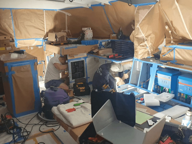 Working in close collaboration with the shipyard team, sharing drawings, the power system was designed and – to a large extent – built remotely. As part of the process, outstanding matters were able to be decided in a single on-site meeting. Details – such as the layout of the custom-made photovoltaic array – were physically laid out in template, and a collaborative construction schedule was agreed.