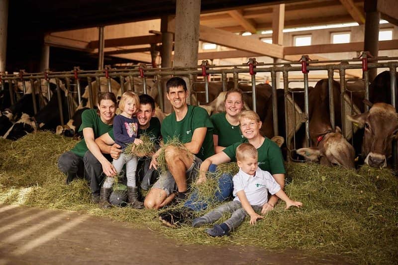 Der Mooshof is one of the largest farms in the Bregenzerwald region. Three generations of the Greber family work here full-time, with around 80 dairy cows, young cattle, goats, and pigs.