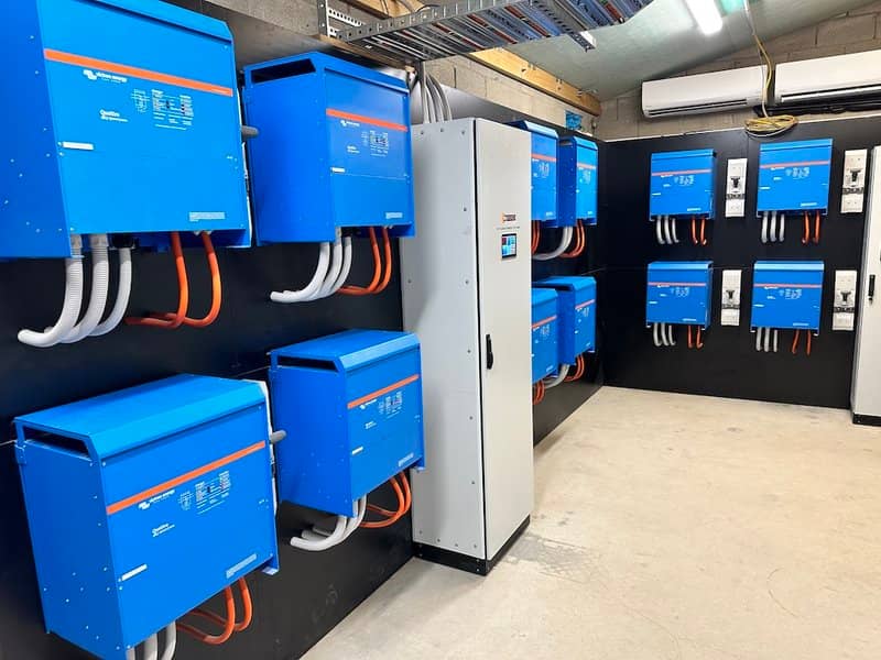After months of work: evaluating the farm’s grid power consumption, followed by design then build of the containerised battery based power system – the time finally arrived to demonstrate the resilience of the Puiul Dobrogean poultry farm’s 180kVA private power plant …by disconnecting the electricity grid whilst the power consumption was running at 141kW! Nothing happened. In a good way. The load was transferred to the battery-based energy installation without so much as a flicker! The Romanian poultry farm consumes 1.5MWh of energy per day in the height of summer and had been relying on two back up generators to overcome grid failures; but when one of the generators failed to start – endangering livestock – it was clear that there was a vulnerability which could not be tolerated. Ionel Dobre – the owner of Puiul Dobrogean farm – started his business in 2012 and has expanded it steadily. For him this realisation of energy insecurity brought with it an opportunity – to make a financial investment to drastically reduce energy costs at the same time as guaranteeing energy security. The new installation is projected to supply between 93% and 95% of the farm’s energy consumption. (L) Ionel Dobre (R) Ovidiu Stan Ovidiu Stan is the General Manager at Stoneage Energy – who are based in Cluj-Napoca, Romania – and wanted to implement a technical solution which could charge this huge battery bank efficiently, and through all seasons – not just the summer. Based on the results Stoneage Energy had experienced with their previous large installations, they decided to increase the battery charging capacity by adding 12 MPPT solar chargers to the 12 Quattro Inverter/Chargers – to provide a additional 1200 amps of charging capacity. Storage: Over 1.3 MWh in 48V LiFePO4 batteries (Low Voltage). Low voltage was chosen for safety and because it allowed the use of the most robust inverters available. Inverters: 12 x Quattro Inverter/Charger 15000VA – capable of delivering 180 kVA and managing load peaks – 15000 models can actually handle 25000W peaks. AC/DC Architecture: A hybrid ecosystem using 300 kW of Fronius Tauro 100 inverters (AC-coupled) for direct daytime consumption and 12 SmartSolar MPPT 250/100 solar charge chargers = 1200 Amps (DC-coupled) to efficiently and directly charge the battery bank. PV panels: Over 600 bifacial panels rated at 645W (510 pcs on the 3 Tauros + 96 pcs on the 12 MPPTs) offer a total of ≈ 400 kWp. Monitoring: Cerbo GX & VRM Portal . Safety via Loop: The hall’s electrical grid was designed in an underground loop. If a cable is accidentally severed (e.g., by an excavator), power is supplied via the other arm of the loop, ensuring 100% continuity. AI Automations with Node-RED : Node-RED Temperature de-rating and shutdown code The system features several innovations developed by Stoneage Energy engineers specifically for large projects like this one, including: A huge pre-charge & emergency shutdown system, controlled by in-house software for controlling and monitoring more than 100 parameters of the whole system. Rapid shutdown & pre-pre-charge: For complete system disconnection in the unlikely event of any fault. Dynamic Power Balancing: For large systems when solar production is low and/or the grid is weak or unstable. Battery protection mode: Maintains a useful power reserve for power outages or a low next day power harvest forecast, consumption, and grid energy costs. Ionel says “Energy is monthly business cost. Once you install a system like this, that cost becomes an investment – this equipment is built to last 15-20 years.”