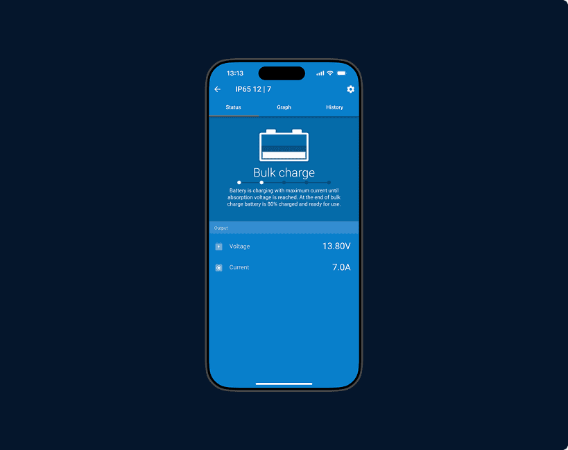 Ilmainen VictronConnect-sovellus Androidille tai iOS:lle antaa sinun säätää latausprofiileja, seurata reaaliaikaista tilaa ja tarkastella käyttöhistoriaa, jotta voit pysyä latauksessa koskematta laturia.